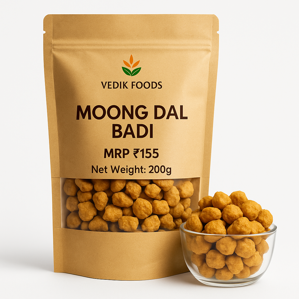 Our Moong Dal Badi is made from high-quality moong dal, gently processed using a refined preparation method to maintain its natural taste, texture, and nutritional richness. Light, wholesome, and protein-packed, these badis add authentic flavor to curries, stir-fries, and traditional Indian recipes. With no artificial additives or preservatives, they deliver the true goodness of home-style cooking in every bite.